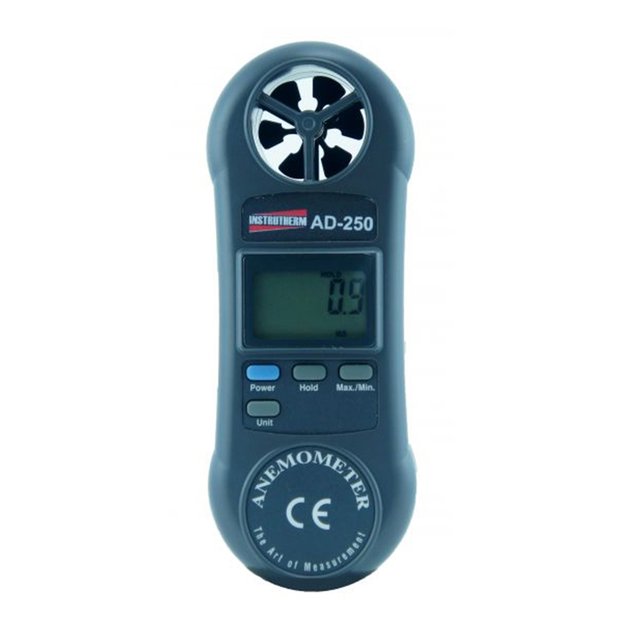 O Anemômetro mod. AD-250 é um instrumento digital e portátil, com display de cristal Líquido (LCD) de 1,4” realiza medição da velocidade do fluxo do ar, os valores são demonstrados em 5 unidades diferentes: ft/min, m/s, Km/h, Mph, Knots. Registra valores máximos e mínimos, conta com a função de congelamento de dados, indicação de bateria baixa e sobre escala. Seu circuito micro processado de baixo consumo é alimentado por uma bateria de 9 V. Leve compacto, adequado para o manuseio com uma das mãos.