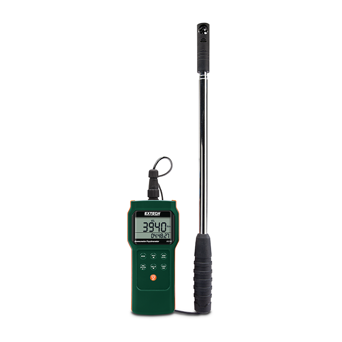 O AN340 é um registrador de dados CMM/CFM Anemometer/Psychrometer. Este medidor mede a velocidade/volume do ar, temperatura, umidade, bulbo úmido e ponto de orvalho. O usuário pode armazenar até 12.000 leituras para análise de dados. Armazena ou recupera manualmente até 99 leituras. Completo com minisonda de palheta externa, software compatível com Windows, cabo USB, 6 pilhas AAA e estojo rígido.