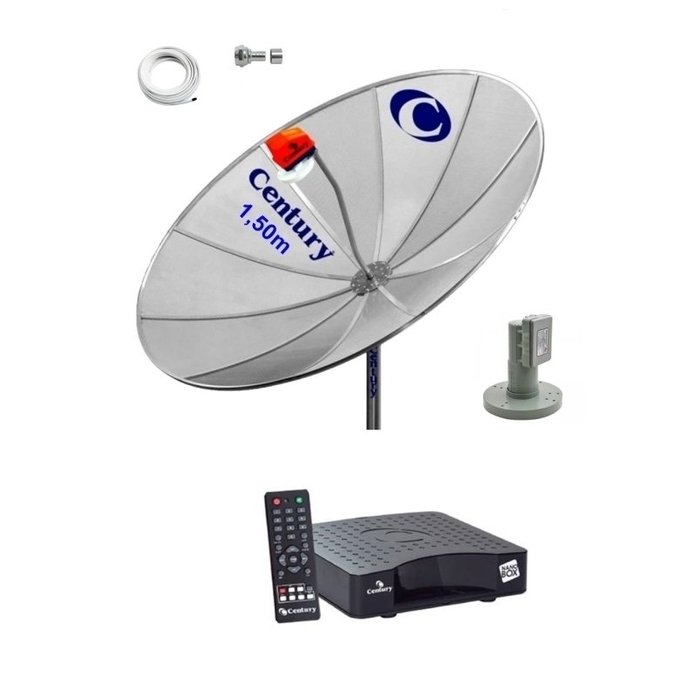 Kit Antena Parabólica Century 1,5mt com 1 Receptor Nanobox Century+ Monoponto+Cabo As antenas Century são resistentes às intempéries, fáceis de instalar e oferecem a melhor relação custo-benefício do mercado.Se você quer ter as imagens mais nítidas e o melhor som, mesmo nos pontos mais remotos do país, as antenas Century são a escolha certa, sempre. Antes de adquirir um Sistema Century verifique se o serviço de Instalação esta incluído no orçamento. LNBF Monoponto LNBF é um conversor de sinais de satélite, quer dizer Low Noise Block Downconverter Feeder, é quem faz a comunicação entre o satélite e seu Receptor. Na maioria das parabólicas o aparelho é usado no centro de sua antena, seja por uma bengala ou por um tripé, responsável também pela troca de polarização de vertical para horizontal NANOBOX Century O receptor Century foi