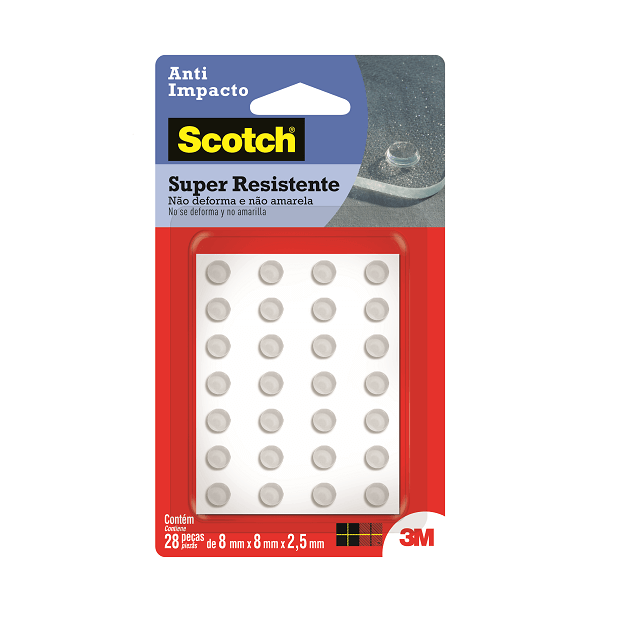 Com fixação rápida e forte, o Anti-Impacto 3M Scotch® pode ser encontrado em diversos formatos e tamanhos. Com alta resistência, pode ser utilizado em portas, janelas, maçanetas, tampas, gavetas, esquadrias, tampos de mesa, gabinetes de cozinha e banheiro, portas de guarda-roupas, eletrodomésticos e computadores. É à prova d?água e possui a qualidade única da 3M, que garante qualidade e ótimos resultados. Como usar: Para aplicar o Anti-Impacto 3M Scotch® as superfícies devem estar limpas, secas e livres de gorduras (ceras, óleos etc). Remova o liner protetor e aplique pressionando contra a outra superfície.