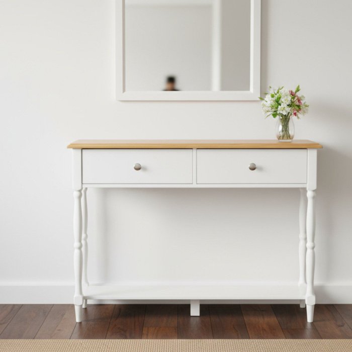 Aparador 2 Gavetas Tampo em Madeira Maciça Pés Torneados Louise Branco/Mel