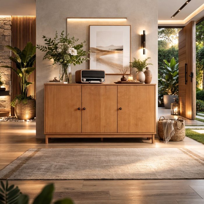 Os pés retos em madeira maciça reforçam a robustez do móvel e garantem maior estabilidade no uso, tornando-o uma peça durável e versátil para diferentes estilos de decoração.