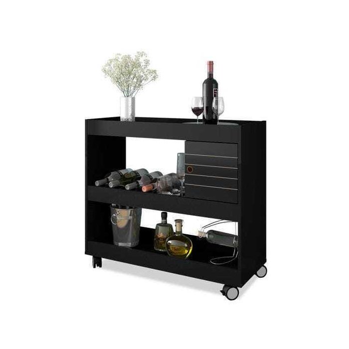 Aparador Bar Adega Cristal de Madeira com Rodizios Preto Fosco