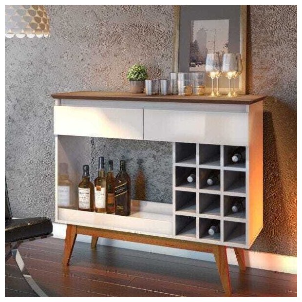 Olha esse lindo Aparador Bar com Adega de 12 Nichos e 2 Gavetas, um Aparador que une o útil com o agradável, estilo Retrô e moderno com sofisticação. Fabricado em MDP 15mm; Tampo em MDF 25mm (45º) Gavetas com corrediças telescópicas. Pé em madeira maciça e frente das gavetas em MDF; Adega com capacidade para 12 garrafas. Pode ser usado na sala de jantar, sala de estar ou hall de entrada. Esse é o Aparador Bar com Adega Classic Retrô, perfeito para você.