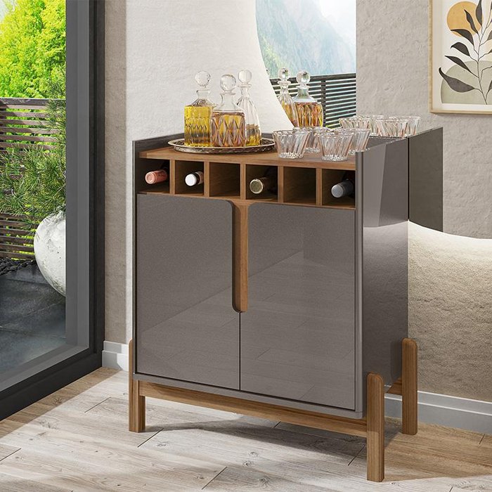 Aparador Bar Lizz Adega para 6 Garrafas Pé de Madeira Maciça Cinza Perola/cedro