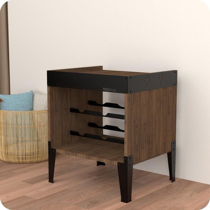 O Aparador Bar é um móvel elegante desenvolvido especialmente para amantes de bebidas destiladas e de um bom vinho. Cada peça do Aparador Bar Retrô foi pensada para agradar aqueles que sabem apreciar o que existe de melhor na vida. A sala é o ambiente mais visitado da casa, é o primeiro lugar que os visitantes conhecem. Sendo assim, o visual da sala pode gerar uma boa ou má impressão, não é mesmo? Para te ajudar a ter um ambiente moderno, unimos o estilo retrô com o conceito industrial e o resultado foi esse Aparador Bar com design exclusivo! Ambientes indicados: Sala de estar, sala de jantar, cozinha, área de festa, bares, restaurantes, barbearias, escritórios, entre outros. O Aparador Bar De Sala é fabricado com madeira de 15mm, os pés e as partes metálicas são de aço com acabamento em Pintura Eletrostática Epóxi com proteção contra ferrugem e corrosão, os pés possuem as pontas emborrachadas para não riscar o chão, os desenhos são cortados à laser de alta precisão proporcionando um acabamento perfeito. BENEFÍCIOSDesign ExclusivoEstilo RetrôCorte do aço Preciso Feito à LaserPés EmborrachadosNão EnferrujaAdega para 6 GarrafasEncaixe perfeito para garrafas ESPECIFICAÇÕES TÉCNICASEspessura da madeira: 15mmMaterial dos pés, travessas e molduras: AçoCor da Madeira: AmadeiradoCor das peças de aço: Preto FoscoAcabamento das travessas e molduras: Pintura Eletrostática EpóxiAcabamento dos pés: Pintura Eletrostática EpóxiProteção dos pés: Borracha antiderrapanteQuantidade de Garrafas: 6Requer Montagem: SimComplexidade da Montagem: Baixa, pode ser montado por uma pessoa sozinha MEDIDASAltura: 52cmLargura: 45cmProfundidade: 38cm ITENS INCLUSOS1 Aparador Bar Estilo RetrôKit de InstalaçãoManual de Instrução de Montagem *As cores podem ter pequenas alterações dependendo do seu monitor.*Os objetos que ambientam as fotos não acompanham o produto.
