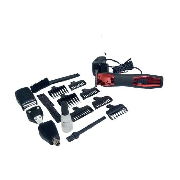 O kit é composto por 17 peças: 1 máquina principal, 1 pente aparador de nariz, 1 aparador de design, 1 pente micro barbeador, 1 pente aparador de precisão, 7 pentes removíveis usado no corte de barba ou cabelo, 1 cabo USB, 1 pente de limpeza, 1 escova para limpeza, 1 frasco de óleo lubrificante e 1 suporte de máquinas e pentes.