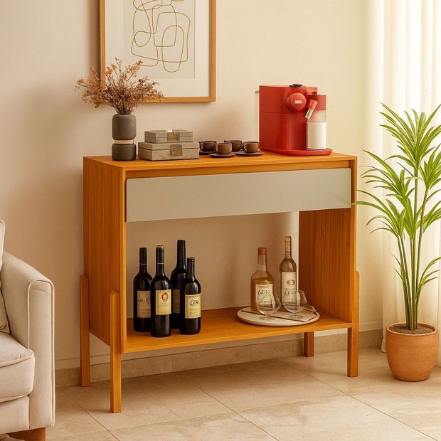 Com pés de madeira "palitos", prateleira superior estilo bandeja, espaço adega para 6 garrafas e espaço para armazenamento e decoração usar sua criatividade.