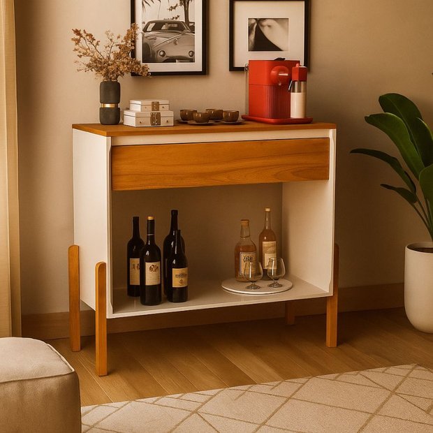 Com pés de madeira "palitos", prateleira superior estilo bandeja, espaço adega para 6 garrafas e espaço para armazenamento e decoração usar sua criatividade.