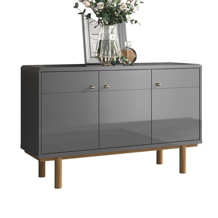 Aparador Buffet 3 Portas Bordas Arredondadas Pés Madeira 1,20cm Catar - Cinza Perolizado/Tauari -