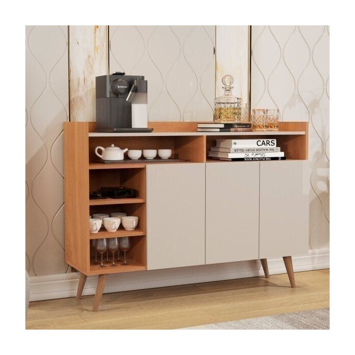 Aparador Buffet Retrô Celta é ideal para sua sala. com designer retrô ele irá agregar muito mais charme e requinte ao seu ambiente. Possui 3 portas com dobradiças metálicas, nicho e prateleiras, excelente espaço interno. Um amplo tampo para acomodar bebidas, objetos de decoração, taças etc. Elaborado com chapas em madeira MDP e pés em madeira maciça, esses atributos garantem ao produto maior resistência e durabilidade.