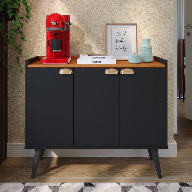 O móvel é composto por três portas que oferecem bastante espaço interno para armazenamento de objetos, como: louças, copos e utensílios diversos. Além disso, ele também conta com um amplo tampo que permite organizar e exibir itens decorativos.