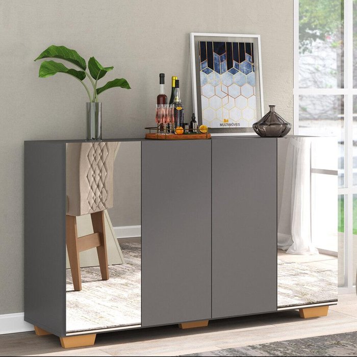 O Aparador Buffet com Espelho e Pés Quadrados Vegas Multimóveis é produzido em MDP, que garante maior durabilidade, além de um acabamento superior. Com 4 portas, possui acabamento acetinado (cerca de 20% de brilho) e um excelente espaço interno para organizar seus pertences (as prateleiras internas suportam 5 Kg cada e o tampo 10 Kg). Os pés quadrados, em polipropileno, facilitam na hora da limpeza. Os detalhes com espelhos nas portas deixam o móvel mais requintado, criando um ambiente moderno e charmoso. Os espelhos são de vidro (o que evita que a imagem fique distorcida) e lapidados, ou seja, passam por um processo para que as bordas não fiquem cortantes, o que garante maior segurança. Seu design minimalista, torna o móvel muito versátil, podendo ser utilizado de diversas maneiras e em qualquer ambiente.