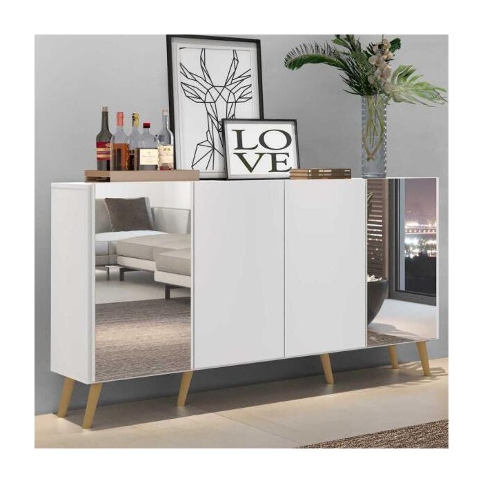 Aparador Buffet com Espelho e Pés Retrô Vegas Branco/Natural Branco/Natural