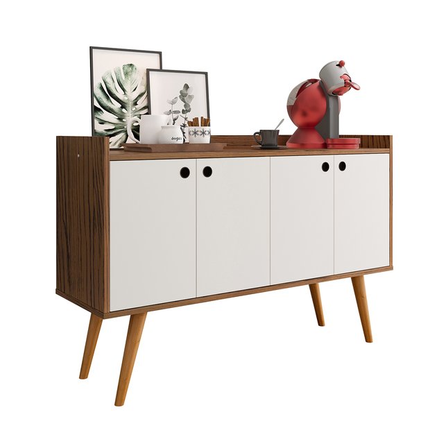 Ele conta com 4 portas, prateleiras internas e pés palito em madeira maciça, garantindo maior durabilidade ao produto. Também dispõe de um amplo tampo a qual pode ser utilizado para acomodar eletrodomésticos e itens decorativos.