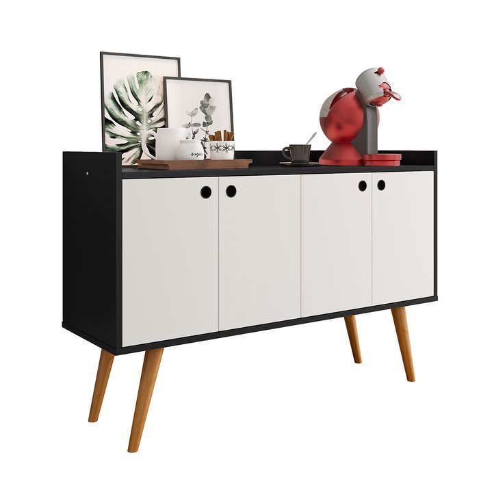 Ele conta com 4 portas, prateleiras internas e pés palito em madeira maciça, garantindo maior durabilidade ao produto. Também dispõe de um amplo tampo a qual pode ser utilizado para acomodar eletrodomésticos e itens decorativos.