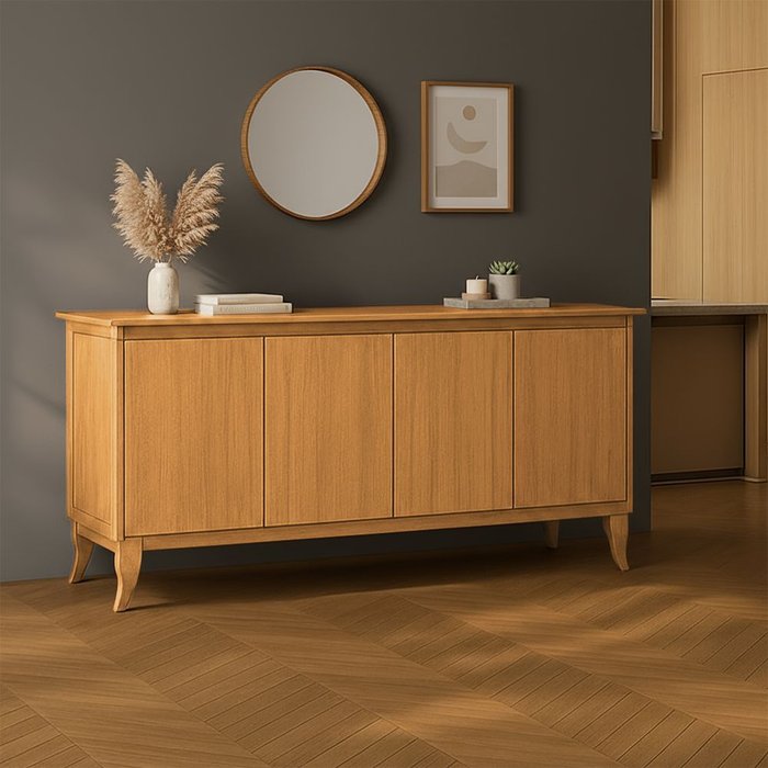 Fabricado em madeira de alta qualidade, o aparador garante durabilidade e estabilidade, proporcionando um toque acolhedor e natural à decoração. Seu design versátil combina facilmente com diferentes estilos de ambiente, tornando-se um complemento ideal para qualquer espaço.