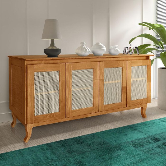 Dimensões do produto: Largura 163 cm; Profundidade 41 cm; Altura 75,5 cm.Itens Inclusos: 1 aparador- Produzido em madeira pinus, com componentes internos em MDF- Suporta até 70 Kg- As prateleiras suportam até 10 Kg- Pés estilo retrô- 4 portas com uma telinha especial, que deixa o seu produto fantástico- Aparador com um modelo mais rústicoComplexidade da montagem: Média, pode ser montado por mais de uma pessoa e/ou necessite de maior conhecimento para montagem.Recomendações de uso, manutenção e limpeza: Limpar com flanela ou pano macio seco, não utilizar produtos abrasivos, desengordurantes, álcool ou solvente. Não expor o produto diretamente a luz solar e à umidadeGarantia: 3 meses