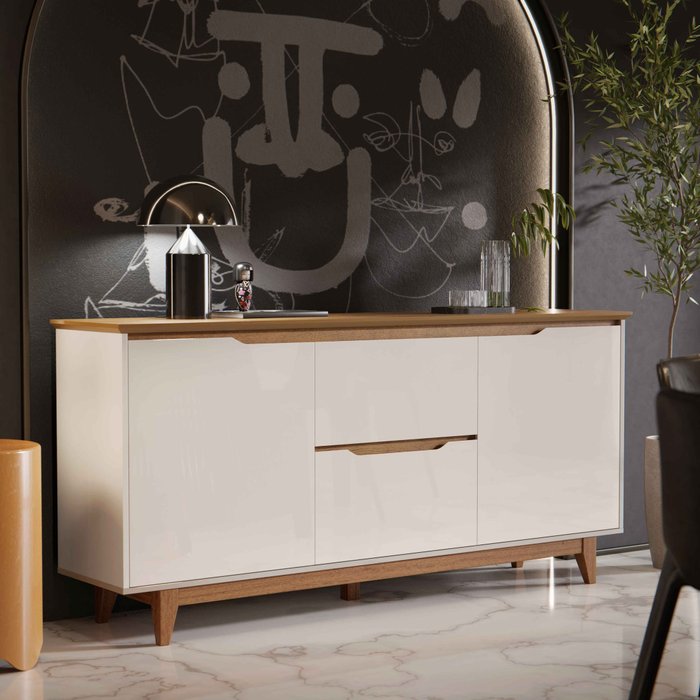 Aparador Buffet Sala Flow 2 Portas 2 Gavetas com Pés de Madeira - Rede Móveis Off White/Freijó