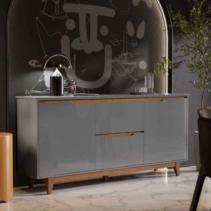 Aparador Buffet Sala Flow 2 Portas 2 Gavetas com Pés de Madeira - Rede Móveis Cinza/Freijó