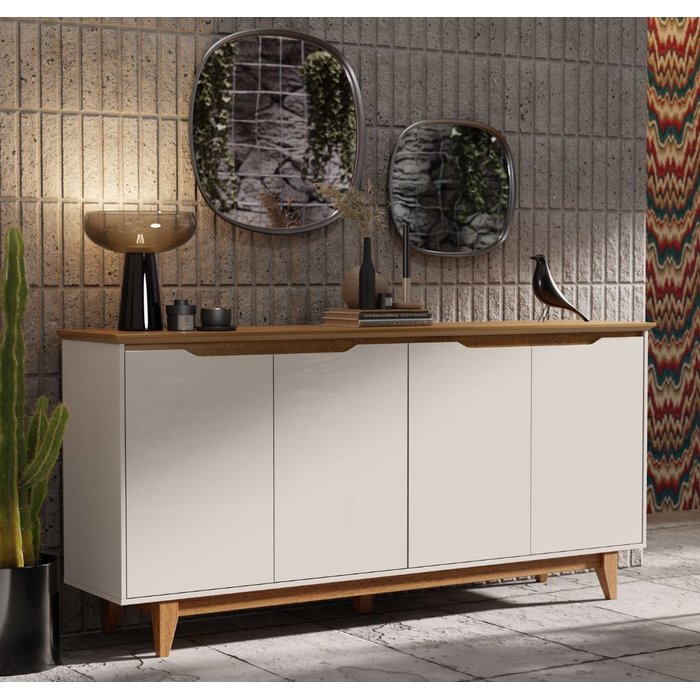Aparador Buffet Sala Flow 4 Portas com Pés de Madeira - Rede Móveis Off White/Freijó
