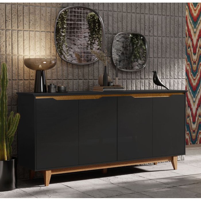 Aparador Buffet Sala Flow 4 Portas com Pés de Madeira - Rede Móveis Preto/Freijó