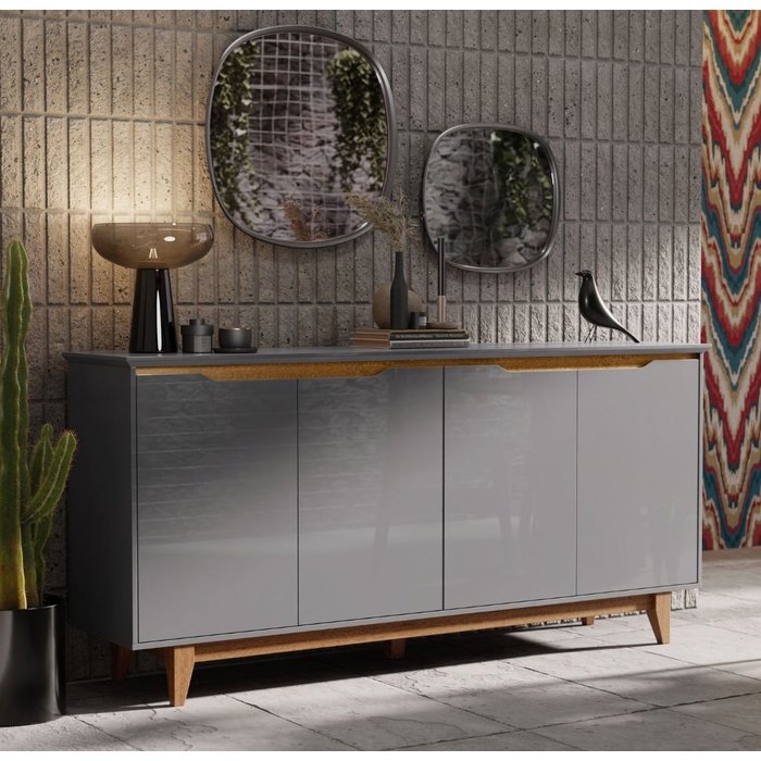 Aparador Buffet Sala Flow 4 Portas com Pés de Madeira - Rede Móveis Cinza/Freijó