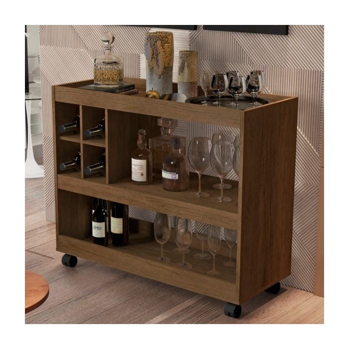 Com um lindo design, ela possui adega para 4 garrafas e divisórias que ajudam na acomodação de suas louças, ainda conta com rodízios que facilitam o transporte!