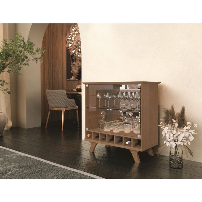 100% MPF - Tampo superior com bordas em 45 graus; portas e prateleiras interna todo me vidro, fundo com espelho; repartição de adega com lugar para 7 garrafas; seus pés retrô em madeira maciça de reflorestamento.