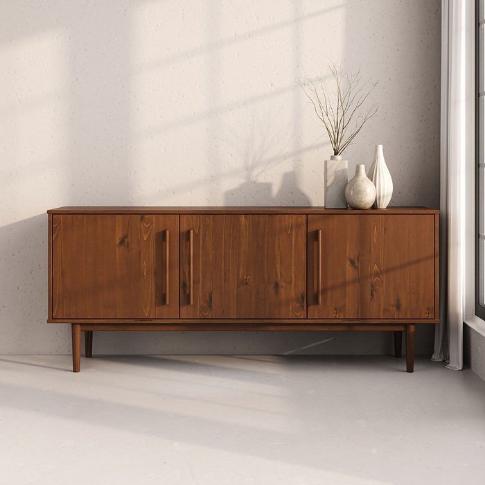 O design autêntico com puxadores esculpidos na própria madeira reforça a proposta limpa da linha. A frente contínua com 3 portas traz elegância discreta, enquanto os pés cônicos retos elevam o conjunto com leveza.