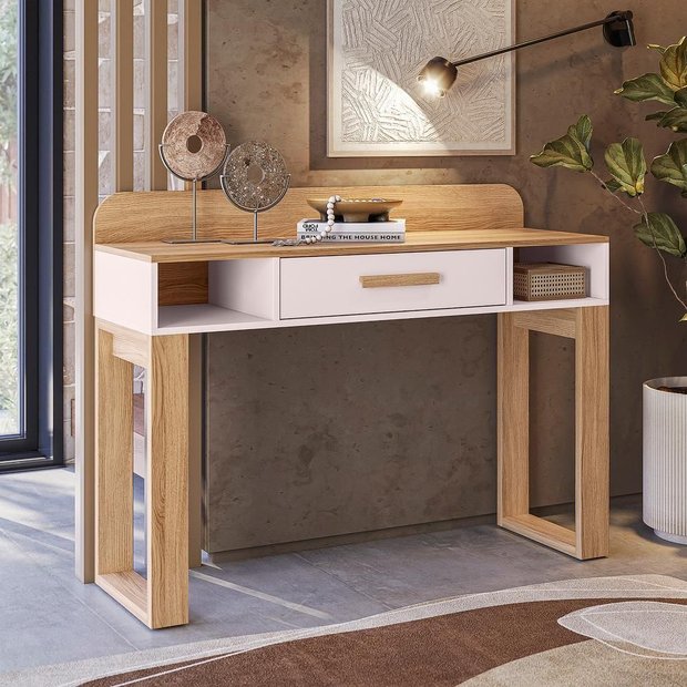 Organização prática: conta com gaveta central e nichos laterais para guardar objetos, livros e itens decorativos. Estrutura resistente: produzido em MDP de alta qualidade, com excelente acabamento em pintura UV que traz mais durabilidade. Detalhes de destaque: puxador em MDF e pés com design moderno, garantindo estabilidade e estilo.Dimensões Produto Montado:Altura: 95 cmLargura: 1,20 cmProfundidade: 40 cmMedidas dos Nichos Laterais – Altura: 14 cm / Largura: 27 cm Profundidade: 38 cmMedidas Gaveta – Altura: 13 cm / Largura 59 cm / Profundidade: 38 cm