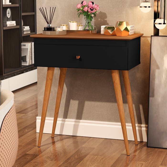 Aparador Mesa Lateral Preto Freijó para Sala de Estar C/ Gaveta e Pé Palito em Madeira