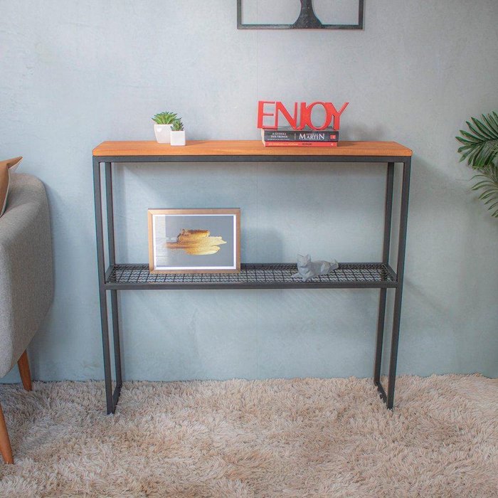 Aparador para Sala em Ferro Preto com Tela e Tampo em Pinus Stain - 100x92cm -