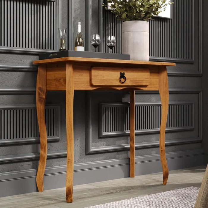 Transforme seu ambiente com este aparador rústico em madeira maciça, que combina design clássico, resistência e praticidade. Ideal para salas de estar, corredores ou halls de entrada, é a escolha certa para quem valoriza organização e elegância em um só móvel.Destaques do ProdutoEstrutura em madeira maciça – mais durabilidade e sofisticação natural.Tampo amplo e resistente – perfeito para apoiar ou exibir objetos decorativos.1 gaveta espaçosa – com corrediças de madeira, ideal para guardar pequenos itens.Pés torneados estilo Luís XV – charme clássico que valoriza qualquer ambiente.Puxador metálico – detalhe funcional que complementa o design rústico.Dimensões do ProdutoLargura: 77 cmProfundidade: 36 cmAltura: 74 cmInformações AdicionaisMontagem: complexidade média (recomendada para duas pessoas ou montador experiente).Limpeza: pano macio seco ou levemente umedecido; não utilizar abrasivos, álcool ou solventes.Conservação: evitar exposição direta ao sol e à umidade.Itens inclusos: 1 aparador.Garantia: 3 meses contra defeitos de fabricação.