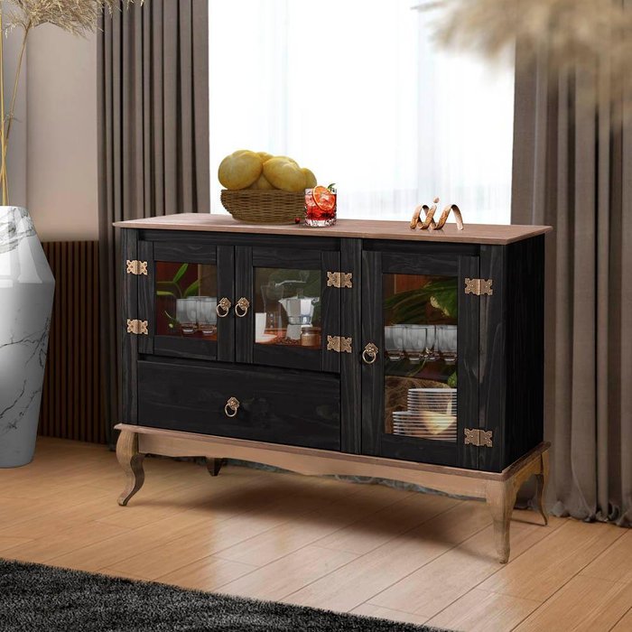 Aparador Rústico Madeira Maciça 3 Portas Vidro Preto Garapa D125 Denk