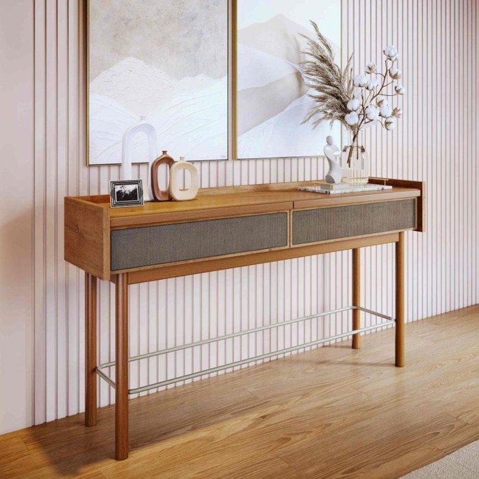 Transforme seu ambiente com este aparador que une sofisticação e funcionalidade. Com um design moderno e acabamento impecável, ele é perfeito para quem busca peças com personalidade. Design Sofisticado com uma combinação harmoniosa de madeira maciça (base, pés e puxadores) com tampo "bandeja" em MDF chanfrado de borda laqueada além dos detalhes Exclusivos:Frente das gavetas em MDF 15mm com borda laqueada e tela sintética aplicada, adicionando textura única, possui 2 gavetas espaçosas equipadas com corrediças telescópicas para abertura suave e total. Estrutura Robusta: Laterais de 25mm e um elegante arco de aço na base garantem durabilidade.