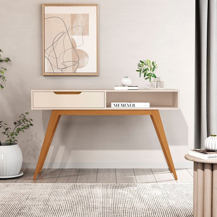 O aparador Tucumã possui tampo, base e laterais em MDF de 15cm, gaveta com puxador usinado e corrediça telescópica, nicho porta objetos, além dos pés e travessas em madeira maciça.