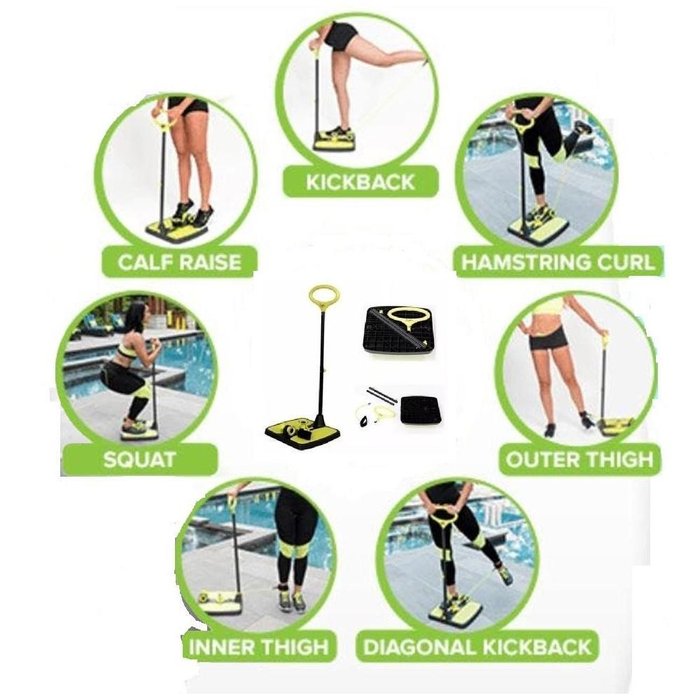 Composto por uma plataforma e alça expansível que se dobra sobre si mesma, facilitando o transporte com você aonde quer que vá. Você pode usá-lo para exercitar a parte superior e a inferior do corpo. As tiras na base prendem-se aos tornozelos para que você possa realizar uma variedade de movimentos de perna com a resistência que você definir. A alça se desprende do sistema para que você possa realizar exercícios de braço com a mesma resistência. Você pode realizar exercícios analisados e comprovados, como extensões de perna, flexão da perna, flexão lateral, flexão lateral, ou agachamento assistido com a ajuda do sistema Booty Max.
