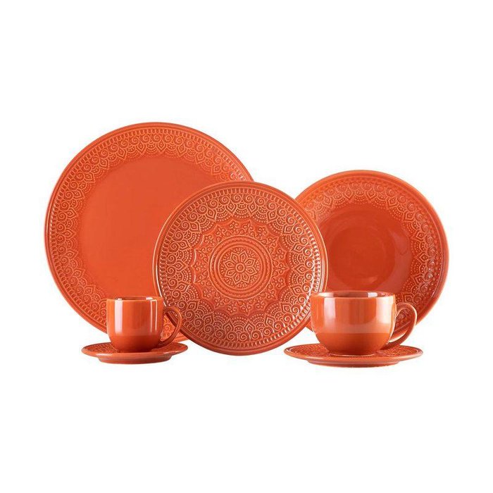 O Aparelho de jantar Agra na laranja é completo, produzido em cerâmica Faiança. Serve até 6 pessoas em todas as refeições diárias.