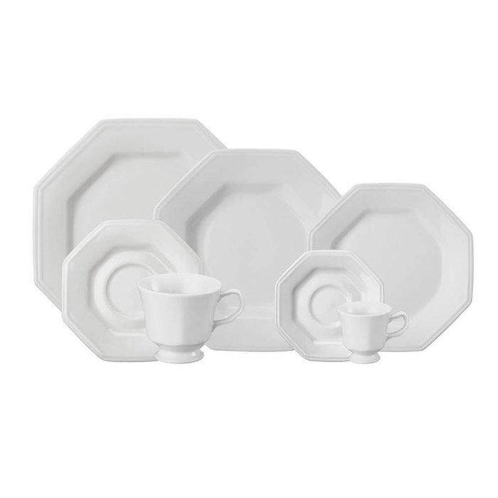 Composição: 6 Pratoas Fundos 24cm, 6 Pratos Rasos 28cm, 6 Pratos Sobremesa 20cm, 6 Pires para Xícara de Chá, 6 Xícaras de Chá, 6 Pires para Xícara de Café, 6 Xícaras de Café