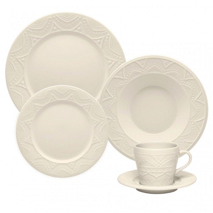 O modelo Serena mescla a sutileza do clássico com a suavidade do romantismo. Os detalhes em alto-relevo que decoram as peças dessa coleção foram inspirados nas mandalas. Mandala é uma palavra em sânscrito que significa “círculo” e é conhecida como um símbolo universal da integração e harmonia. As mandalas geralmente apresentam padronagens geométricas, florais e, algumas vezes, de figuras humanas. Muito presente nas culturas budista e hinduísta, esse elemento já se tornou referência no mundo todo. Louças com detalhes em relevo continuam em alta. A Oxford, de olho nessa tendência, apresenta mais um modelo de aparelho de jantar com alto-relevo. O off-white é sutil e muito versátil. Esta cor permite que o destaque sejam as refeições servidas. 4 pratos rasos com 26 cm de diâmetro / 4 pratos fundos com 23 cm de diâmetro / 4 pratos para sobremesa com 20,5 cm de diâmetro / 4 xícaras para chá (200 ml de capacidade) com pires (15 cm de diâmetro)