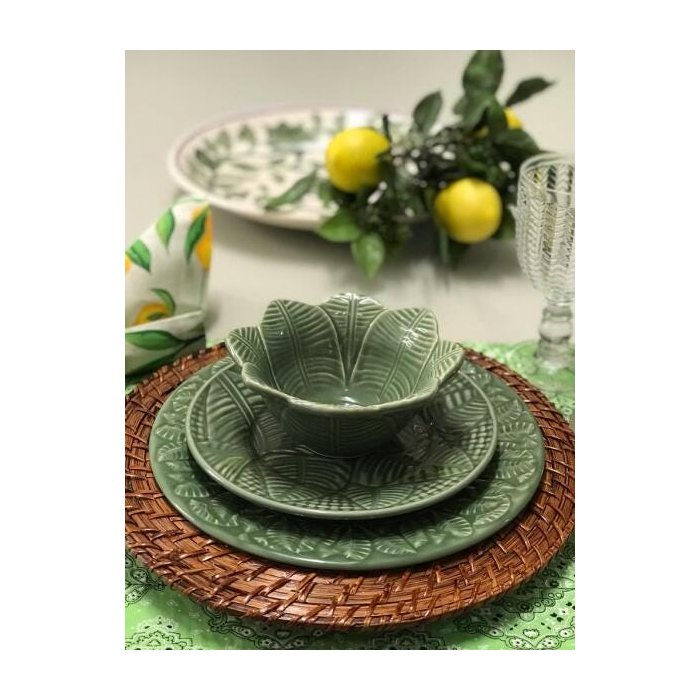 Aparelho de jantar na cor verde e detalhes em médio relevo. Bowl com bordas em formato de folhas.