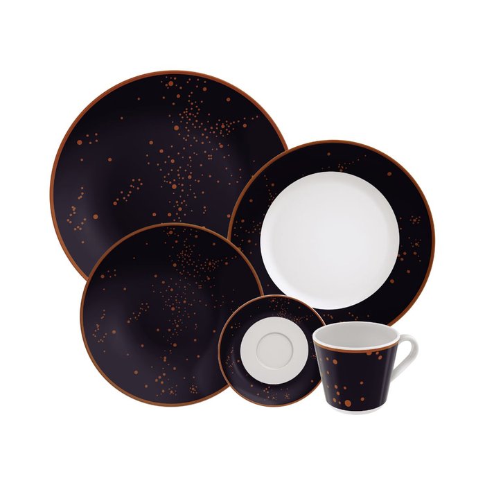 4 Pratos Rasos 28 cm; 4 Pratos Sobremesa 21 cm; 4 Pratos Fundos 23 cm; 4 Pires Chá; 4 Xícara 250 ml.