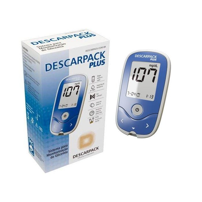 SISTEMA MONITORIZAÇÃO GLICEMIA DESCARPACK PLUSAparelho de medição de Glicemia Descarpack PlusDesenvolvido para fornecer uma leitura rápida e precisa em um processo simples e de fácil manuseio.É indicado para a monitoração da glicose sanguínea capilar ou venosa de uso domestico por indivíduos portadores de diabetes , ou em ambientes clínicos por profissionais de saúde,para auxiliar na monitoração eficaz do controle de diabetes.-Sem codificação-Sistema reagente GDH-FAD-Requer apenas 0,5 ul de volume de amostra- Ampla faixa de hematocrito 0-70%-Capacidade de memoria para ate 500 testes-Liga e desliga automaticamente- Resultados precisos do teste em 5 segundos-Acompanha diário de autoteste para melhor controle da glicemia- Sistema para monitorização de glicemia Descarpack Plus são avaliados e regularizadas conforme a norma ISO15197:2013Itens inclusos:- 01 Glicosímetro (99GM80)- 01 Tira de verificação (01GCH12)- 01 Bateria 3V (CR2032)- Estojo- 01 Guia de Instruções de uso- 01 Diário de autoteste.****CUIDADO COM FALSIFICAÇÕES COMPRE APENAS DE EMPRESAS COM BOA REPUTAÇÃO. ISSO COMPROVA IDONEIDADE DA EMPRESA PARA COM OS CLIENTES****IMPORTANTE !Temos uma vasta gama de produtos similares a este (medidores, tiras, lancetas de segurança), dentre outros, todos da linha Saúde e Cuidado pessoal.