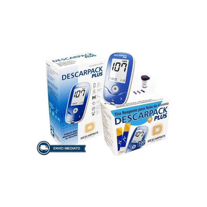 Aparelho de medição de Glicemia Descarpack PlusDesenvolvido para fornecer uma leitura rápida e precisa em um processo simples e de fácil manuseio.É indicado para a monitoração da glicose sanguínea capilar ou venosa de uso domestico por indivíduos portadores de diabetes , ou em ambientes clínicos por profissionais de saúde,para auxiliar na monitoração eficaz do controle de diabetes.-Sem codificação-Sistema reagente GDH-FAD-Requer apenas 0,5 ul de volume de amostra- Ampla faixa de hematocrito 0-70%-Capacidade de memoria para ate 500 testes-Liga e desliga automaticamente- Resultados precisos do teste em 5 segundos-Acompanha diário de autoteste para melhor controle da glicemia- Sistema para monitorização de glicemia Descarpack Plus são avaliados e regularizadas conforme a norma ISO15197:2013=======================================================================Tiras Descarpack PLUS para Teste de GlicemiaValidade 05/2021Tiras reagentes utilizadas no monitoramento, fornece uma leitura rápida e precisa utilizando apenas 0,5µL de volume de amostra sanguínea.Características do produto:- Resultado preciso em apenas 5 segundos;- Necessita apenas 0,5µL de volume de amostra sanguínea;- Compatível com sangue capilar e venoso.Itens inclusos:- 100 tiras reagentes para teste de glicemia descarpack PLUS.- 01 Glicosímetro (99GM80)- 01 Tira de verificação (01GCH12)- 01 Bateria 3V (CR2032)- Estojo- 01 Guia de Instruções de uso- 01 Diário de autoteste.=======================================================================INFORMAÇÕES IMPORTANTES1) O produto é a pronta entrega?R: SIM.2) Tem o selo da ANVISA?R: SIM.3) Emite Nota Fiscal?R: SIM.4) Tem garantia?R: Garantia de 01 mês do vendedor.=======================================================================Clique no botão "Comprar agora" para garantir Aparelho Medidor Glicose Descarpack Plus + 100 Tiras pelo melhor preço!