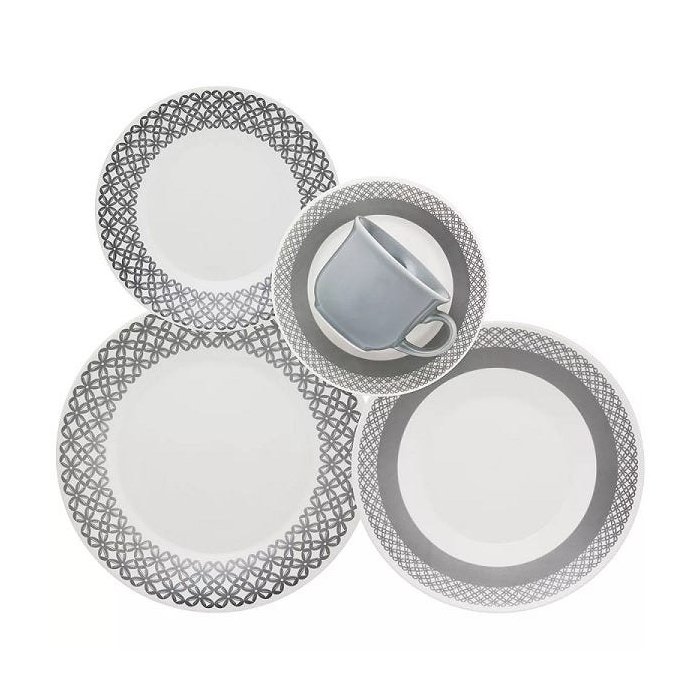Ítens inclusos: 04 Pratos Rasos 24 cm, 04 Pratos Fundos 21 cm, 04 Pratos Sobremesa 18 cm, 04 Xícaras de Chá 200 ml, 04 Pires de Chá 14 cm.