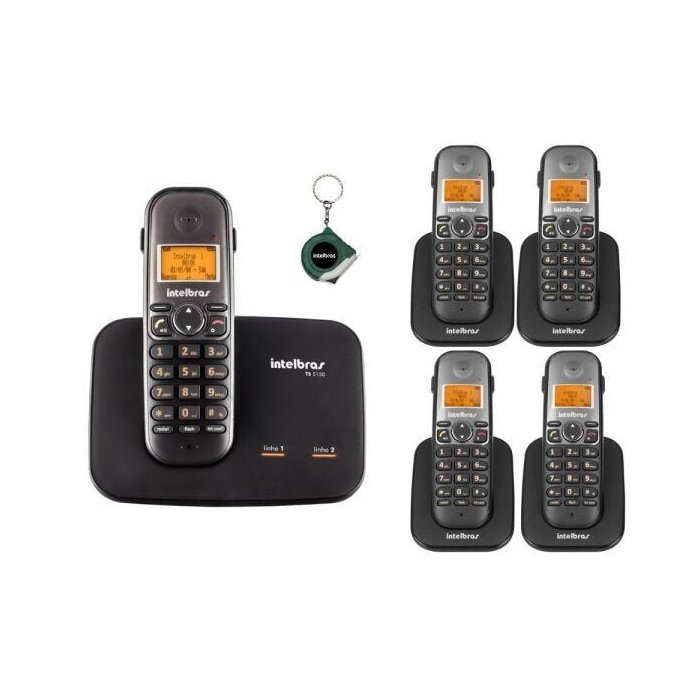 1 Unidade - Telefone sem Fio com entrada para 2 linhas TS 5150 - Intelbras (1 fone , 1 base , 1 adaptador de tensão bivolt , 1 bateria recarregável , 2 cabos de linha telefônica, 1 manual do usuário) 4 Unidades - Ramal sem Fio digital Com ID Chamadas TS 5121 - Intelbras (4 fone, 4 Carregador de bateria para ramal, 4 bateria recarregável, 4 adaptador de tensão bivolt, 4 manual do usuário) 1 Unidade - Trena de 1m em material emborrachado - Intelbras Alcance: Ate 50 Metros em Ambientes Fechados e Com Barreiras, e Ate 300 metros em Local Aberto. ( O alcance pode variar de acordo com a quantidade de barreiras ou interferências). Cor: Preto O TS 5150 tem entrada para duas linhas, trazendo vantagens para quem usa no trabalho ou na residência. Com tecnologia DECT, identificador de chamadas, viva-voz e capacidade de expansão para até 10 ramais (base + 9 ramais), é facilidade em dobro pra você. Identificação de chamadas Viva-voz Capacidade para até 10 ramais (base + 9 ramais)¹ Display e teclado luminosos Entrada para fone de ouvido² Bloqueio de chamadas (a cobrar e originadas) Agenda para 200 contatos, compartilhada entre os ramais¹ Modo Babá³ Prendedor de cinto 10 tipos de toques polifônicos com 7 opções de volume Registro de 15 chamadas atendidas, 20 não atendidas e 15 originadas Comunicação interna, transferência de chamadas e conferência a três¹ ¹ Funções realizáveis entre Telefones sem Fio Intelbras da série TS 51 ² Acessório vendido separadamente. ³ É necessário possuir dois ramais para executar essa função. Temperatura da Operação: 0 °C a 50 °C Adaptador de tensão Entrada: 100/240 V ~ 50-60 Hz Saída: 7,5 Vdc – 300 mA Consumo de energia: Em repouso: aprox.: 1,75 W ou 1,260 KWh/mês Em uso: aprox.: 2,05 W ou 1,476 KWh/mês Bateria: 2,4 Vdc - 600mAh Duração da bateria : Em repouso: 200 h Em conversação: 20 h Frequência de operação: 1.910 a 1.920 MHz Tempo de carga: Aproximadamente: 10 h Dimensões ( A x L x P): Base: 84 × 148 × 96 mm Fone: 154 × 50 × 34 mm