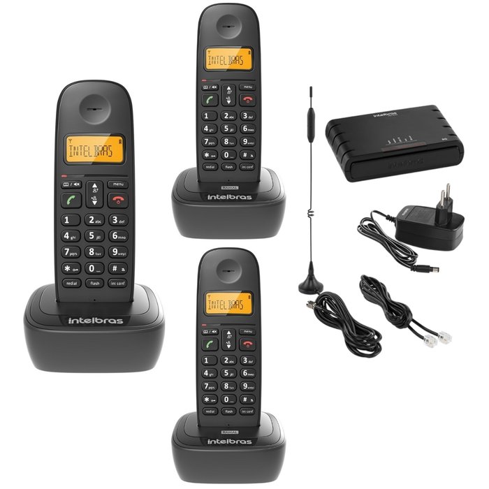 Informações básicas: O Telefone vem com todos os itens necessários para funcionar, é importante que o cliente possua um chip celular habilitado para utilizar junto ao telefone. O chip será inserido na interface celular, essa interface será conectada na base do telefone e todas as chamadas da linha do chip serão efetuadas direto no telefone e no 2 ramais inclusos.