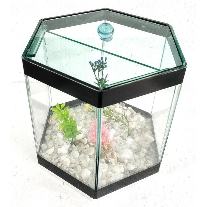 Um lindo aquário no formato sextavado e com uma divisória que pode ser retirado, podendo usar para dois peixes betta macho ou outro tipo de peixe.