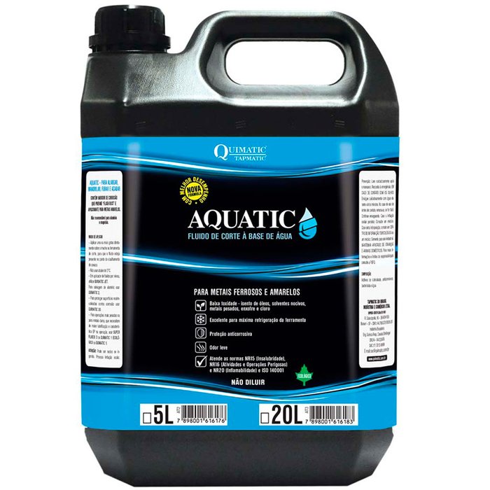 AQUATIC Fluido de Corte à Base D'água 5 L Quimatic Tapmatic O QUE É O FLUIDO DE CORTE AQUATICAQUATIC é um fluido sintético a base de água, ecológico, para corte de metais, constituído por uma combinação especial de lubrificantes sintéticos, aditivos e bactericidas, em água, que garante ao processo ótima preservação, lubrificação e refrigeração. Aumenta a vida útil dos equipamentos e confere um excelente acabamento às peças.AQUATIC tem alta estabilidade e durabilidade. Garante ótima refrigeração e lubrificação. Mantém os rebolos absolutamente limpos e livres de emplastamento, assegurando um ótimo acabamento para as peças. Tem baixa taxa de evaporação. Tem excelente proteção anti-corrosiva. Não ataca máquinas ou peças usinadas. Ecológico – não contém solventes nocivos ou metais pesados. Ideal para empresas que trabalham com sistemas de gerenciamento SMS (Segurança, Meio Ambiente e Saúde Ocupacional) ou ISO 14000. Atende as normas NR 15 (de insalubridade), NR 16 (de atividades e operações perigosas) e NR 20 (de inflamabilidade). COMO UTILIZAR O FLUIDO DE CORTE AQUATICAQUATIC é indicado para operações de corte em metais ferrosos, tais como: rosquear, furar, fresar, mandrilar, alargar, acabar, repuxar, usinar, desbastar, retificar, etc. Pode ser utilizado em todas as máquinas operatrizes e com metais ferrosos e amarelos com ótimo rendimento.Não diluir. Aplicar puro, uma ou mais gotas diretamente sobre o macho ou ferramenta de corte, para que o fluido esteja presente no ponto de cisalhamento do cavaco. Não usar abaixo de 0º C. Em aplicadores de fluidos ou Nebulizadores, utilizar QUIMATIC JET. Para corte de alumínio usar QUIMATIC 2. Para proteger superfícies recém-usinadas contra corrosão usar QUIMATIC 10 ou QUIMATIC 30. COMO PRESERVAR O FLUIDO DE CORTE AQUATICNão ingerir. Evitar o contato com os olhos. Para o manuseio seguro é recomendada a utilização de óculos e luvas de segurança. Estritamente para uso industrial. Para mais informações e limitações de responsabilidade consultar a FISPQ. DESCRIÇÃO DO FLUIDO DE CORTE AQUATIC -Isento de óleos, solventes nocivos, metais pesados, enxofre e cloro;- Produto não inflamável e não combustível para as indústrias mais rigorosas em segurança do trabalho e meio ambiente;- Excelente para máxima refrigeração na usinagem;- Contém aditivos de alta tecnologia para proteção anticorrosiva;- Fornecido em embalagens de 500 mL, 5 L, 20 L e 200 Litros;- Ideal para indústrias que trabalham com sistema de gerenciamento SMS (Segurança, Meio ambiente e Saúde), ISO 14001 e 45001;- Garante máxima refrigeração da ferramenta (evita deformação das peças ou falhas dimensionais);- Não ataca a pele do operador e não forma névoa que possa causar irritabilidade;- Excelente proteção anticorrosiva – não ataca componentes das máquinas ou peças usinadas;- Excelente controle de temperatura – evita deformação das peças ou falhas dimensionais;- Aumenta a vida útil da ferramenta (evita a perda do corte);- Impede a solda do cavaco na ferramenta;- Embalagem com 5 Litros. APLICAÇÃO DO FLUIDO DE CORTE AQUATIC - O fluido de corte à base de água Aquatic proporciona uma série de vantagens para as indústrias comprometidas com o meio ambiente. Para obter os melhores resultados do produto, é importante ficar atento a alguns cuidados essenciais;- Utilize Aquatic apenas em metais ferrosos e amarelos. O produto não é recomendável para alumínio e magnésio. Afinal, por ser à base de água e contar com pH alcalino, pode atacar esses metais. Também não é recomendável para metais muito duros ou operações muito pesadas, já que a lubrificação poderá ser insuficiente para essas situações.- Não usar em ambientes com temperatura menor que 5ºC, para não correr o risco do produto cristalizar. PROPRIEDADES DO FLUIDO DE CORTE AQUATIC- Aspecto: Líquido translúcido amarelado;